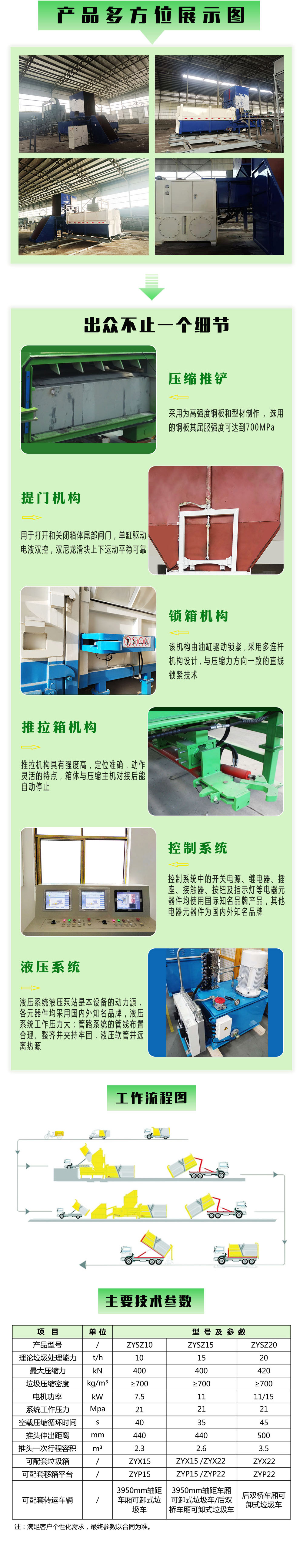 ◆推头推入箱体内行程长,保证闸门下降快于垃圾反弹,垃圾箱装满后,可自动进行强力循环压缩,采用独特的闸门结构,保证闸门关闭后,无垃圾留挂。