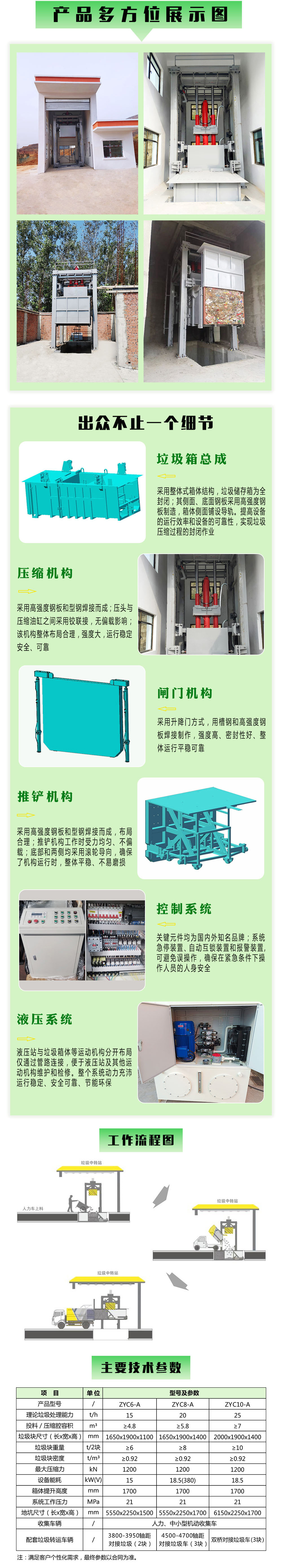◆采用整体式箱体结构,工作运行平稳,利用压头提升箱体,提高了设备的运行效率,实现了垃圾压缩过程的全封闭作业。