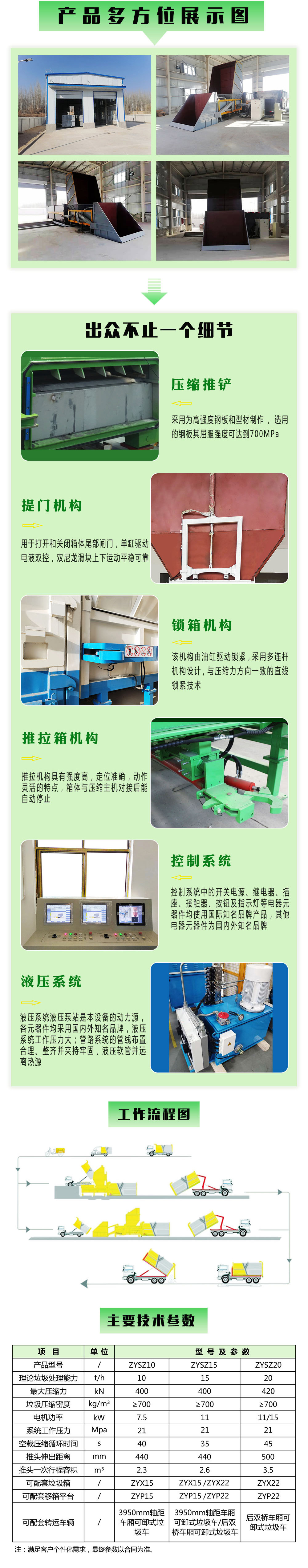 ◆推头推入箱体内行程长,保证闸门下降快于垃圾反弹,垃圾箱装满后,可自动进行强力循环压缩,采用独特的闸门结构,保证闸门关闭后,无垃圾留挂。