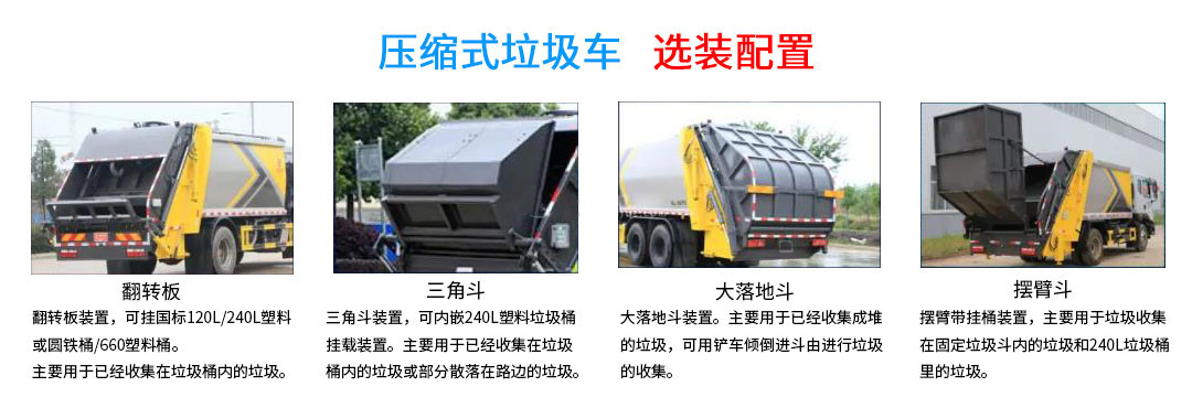 采用Q345锰钢钢板,新式弧形箱体,双联泵、背压阀(压实阀)、油路过滤器,无线遥控,倒车影像,可选挂桶翻转机构,气控密封盖、三角斗、全密封大落地斗、摆臂装置等。